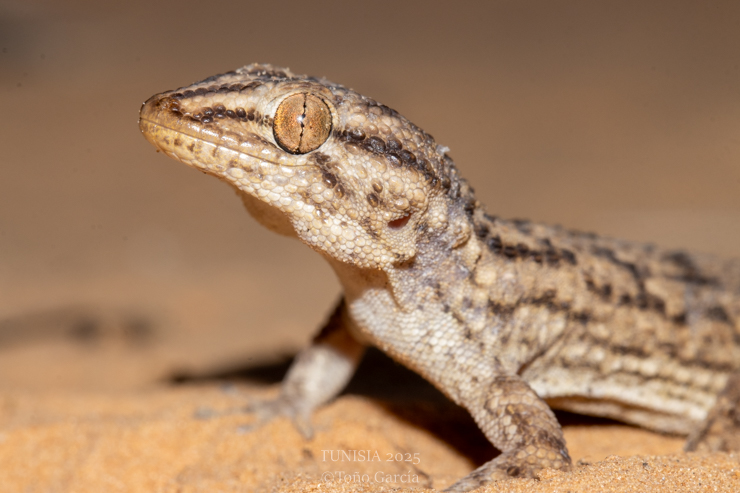 Finally, we arrived to our sleeping place in the sand dunes of Ksar Guilane. It was already night when we began the expedition there. The first animal was a Anthia sexmaculata, a classic of the sand dunes. The habitat looked amazing and there were plenty of Acanthodactylus tracks. Strange that after 3 hours we just saw few Stenodactylus petrii, but not a single snake track. When I was with Toño far of the houses, appeared a motorcycle in the middle of nowhere and drove directly to us. He was surprised about our presence and showed us in the phone a photo handling a dead Varanus griseus. We returned to the sleeping place and found more people walking at night in the dunes without shoes. Very crazy considering that in normal circumstances it could be possible to see vipers semi buried that can bite them. In the village there was a Tarentola neglecta.