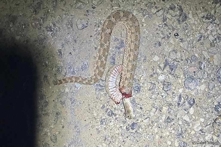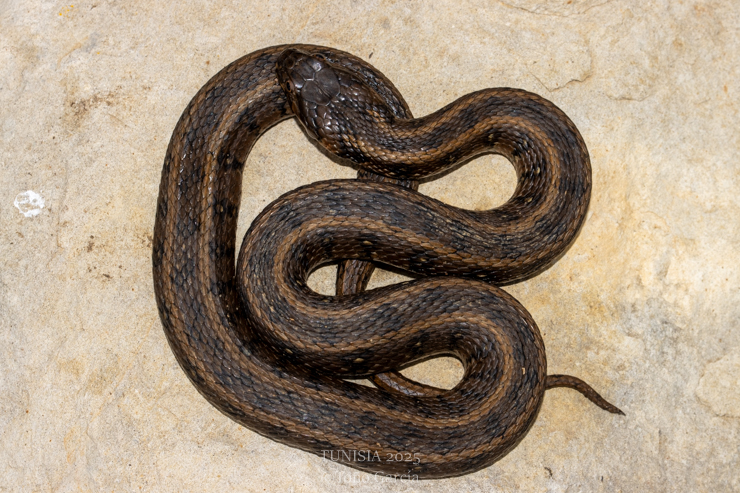 We moved to the south some kilometers and after eating we discussed and finally agreed to try another night in Bou Hedma, this time in a rocky area. Returning to Bou Hedma we could find a dead-on road Psammophis schokari and in more HICROW we rescued 2 Malpolon moilensis and 2 stripped Psammophis schokari.