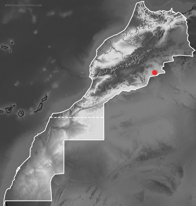 Mapa de distribución conocida de Scincus scincus en Marruecos.