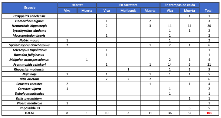 - Hemorrhois hippocrepis y Psammophis schokari son las especies de serpiente que más hemos encontrado. Psammophis es probablemente la especie más adaptable y aparece en zonas tan dispares como la costa húmeda o el desierto extremo de Smara. , mientras que Hemorrhois hippocrepis es extremadamente común en la zona de Tiznit-Lakhssas-Sidi Ifni-Labyar.